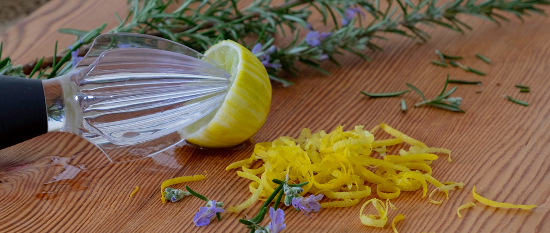 Wash the rosemary and remove from the stalk and finely chop. Add the rosemary and lemon peel to the pan to flavour the base juice