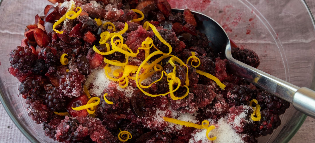 Place all the fruit in a large bowl. Gently mix in the rind, lemon juice and sugar until all the ingredients are incorporated. Cover, refrigerate and allow to macerate overnight.