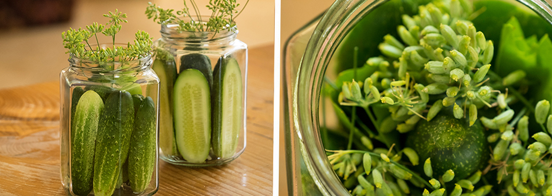Place the dill heads into the jar and pour the hot vinegar mixture over the cucumbers, making sure the cucumbers are completely covered. Leaving a 1.25 centimetre (½ inch) from the top of the jar.