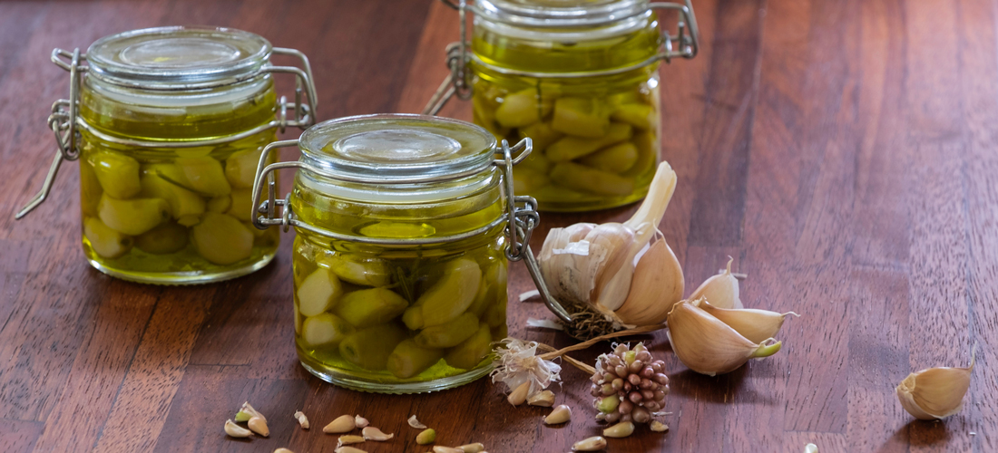 This preserving technique is comprised of a two-part process. The garlic cloves are gently poached in olive oil flavoured with aromatics, placed in jars, then completely covered with the poaching oil to preserve them.