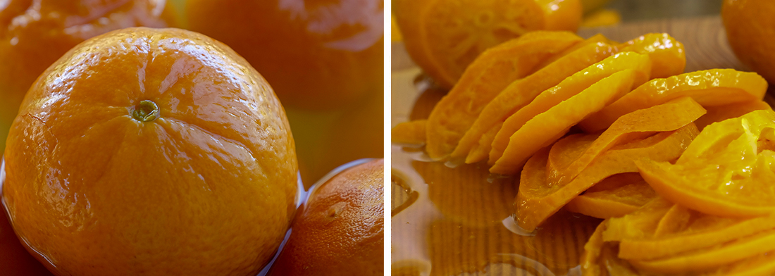 Remove the mandarins and reserve the water. Slice the cooked mandarins. If they contain seeds, remove and discard. Try to reserve as much of the liquid that comes from the mandarins while you are slicing. As the mandarins were cooking additional flavour and pectin from the skin, pith and seeds was extracted. Remove and discard the rosemary.