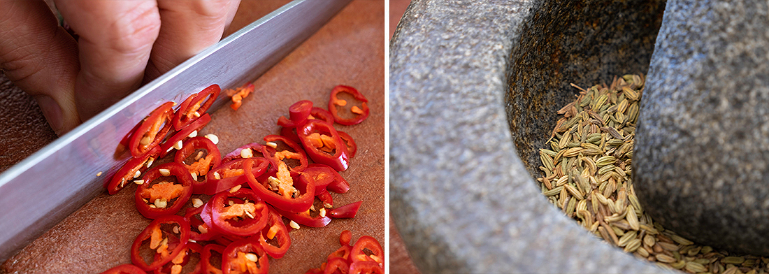Lightly roast cardamon, fennel, and cumin seeds. Allow to cool and finely grind with spice grinder or mortar and pestle. Peel and finely chop the ginger and garlic. Finely chop the fresh chilli. If you want a spicy chutney leave the seeds in. For a milder heat, remove the seeds.