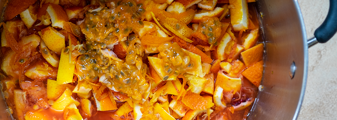 Bring to the boil, then simmer with the lid on until the citrus skins are soft. This stage extracts the orange and passionfruit flavour and the pectin from the citrus shells and pips.