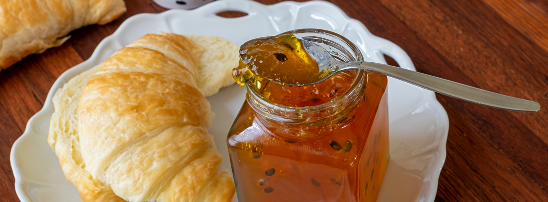 Passionfruit’s sharp tropical citrusy flavour teams up with the orange aromatics to create a delightful full-flavoured spread. Some might call it a jam, others marmalade, call it what you will, but either way you’ll be looking for ways to spread it around. Use on your fave breakfast bread, English muffins, sourdough, croissant, or crumpets. Or jazz up your next cake, sponge, or Danish pastry with a liberal spoon in the filling or as part of the icing. Passionfruit curd, placed in individual pastry shells, topped with this marmalade is sooooo wickedly delicious. Two blissful mouthfuls.