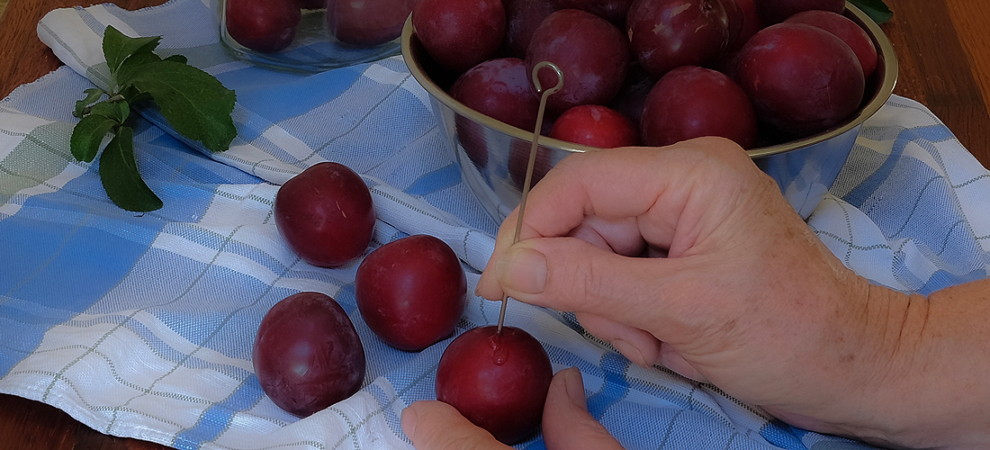 - Pricking the plums will encourage the spiced flavours to be absorbed into the fruit and will assist in reducing the skin from bursting. If this happens, it can be easily removed before bottling if you want to maintain a high level of table presentation.