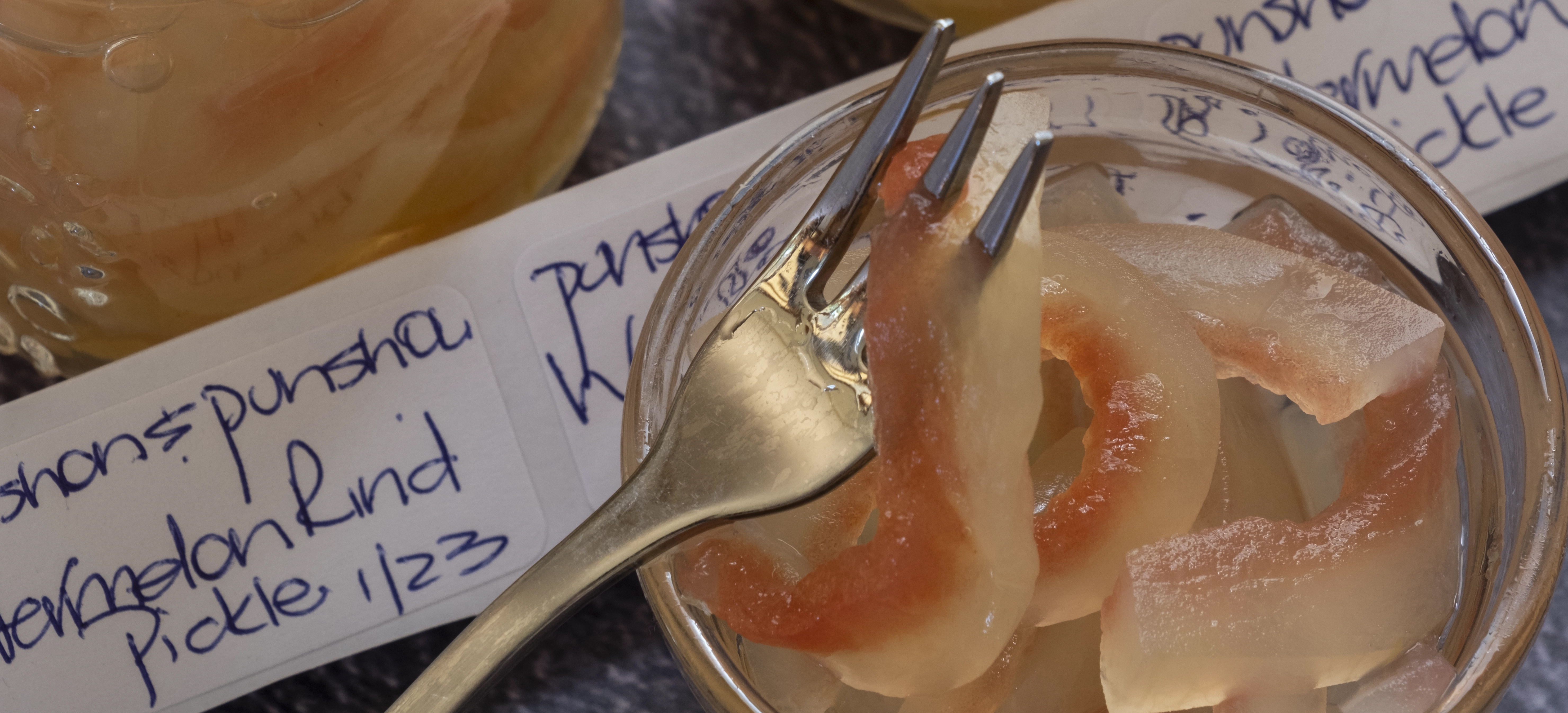 Making small batches works best as a quarter of a medium watermelon will yield approximately 375 grams of prepared rind.