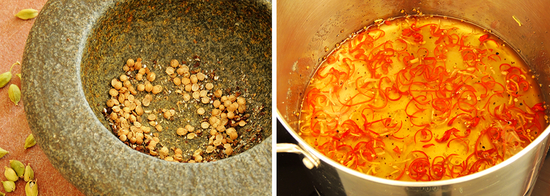 Add the crushed seed mixture, sliced chilli, shredded ginger and sugar to the preserving pan. Bring to a gentle boil, stirring occasionally until the sugar has dissolved. Turn down and simmer for approximately 2 minutes to commence the flavour extraction from the spices. Leave to cool.