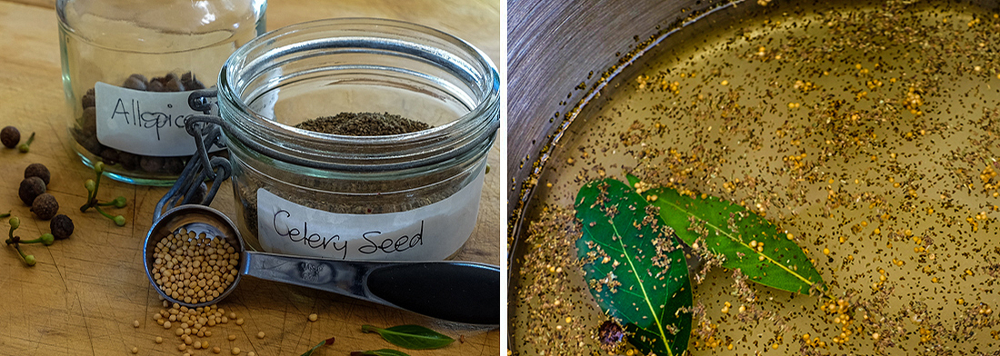 - Spiced vinegar is made by gently simmering the aromatics and vinegar together. It can be made in advance. Strain and store in a cool dark place in the kitchen or pantry. The longer the aromatics are left to steep in the vinegar, the stronger and darker it will become. This may or may not suit our style of pickling For this recipe, the aromatics should not dominate the fresh lively flavour of the cucumbers, capsicum and celery.