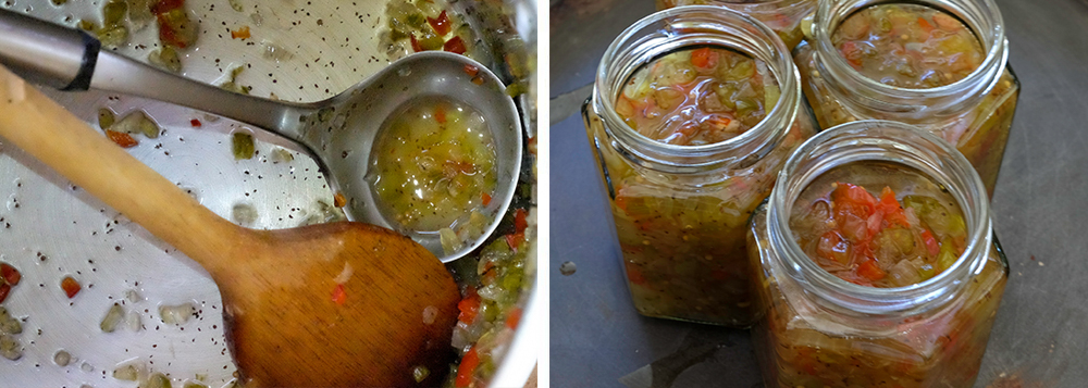 Add the cucumber mixture, return to the heat and simmer, uncovered for approximately 5-8 minutes. Do not over cook as the mixture needs to retain a crunchy texture and the syrup needs to reduce to make a slightly thick consistency. Remove the bay leaves and allspice berries.