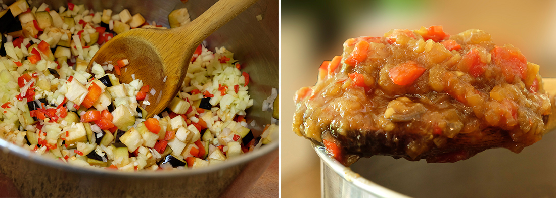 Cut the red capsicums in half, remove the white membrane and de-seed and chop into 1 cm (1/3 inch ) square pieces. Peel the apple, remove the core and chop the same size as the eggplant and red capsicum.